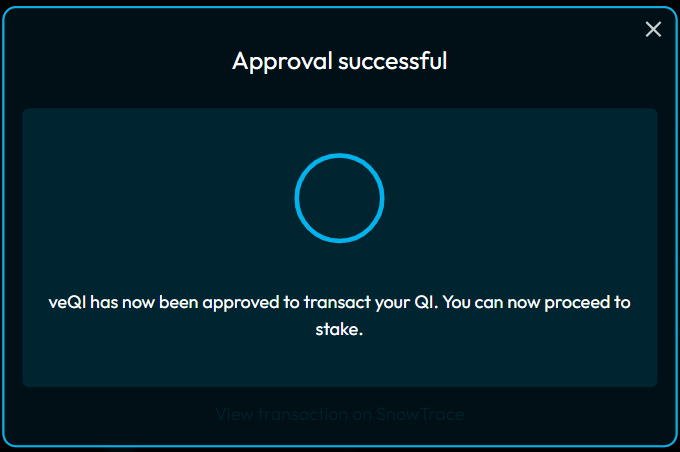 A confirmation will popup to show you that your QI tokens are now approved to be moved from your wallet address. (see image below)