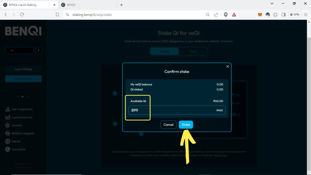 1. Navigate to https://staking.benqi.fi/veqi/stake and connect your wallet. Then, click the “Stake” button.