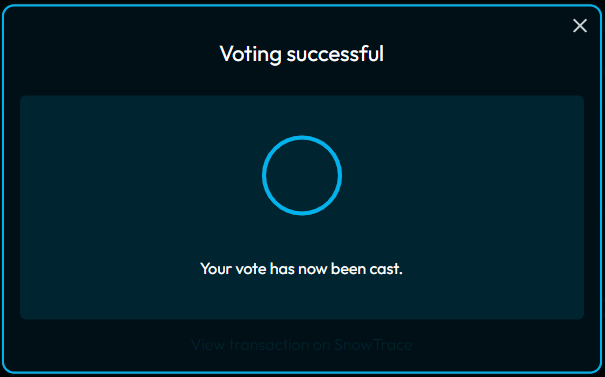A popup will then appear verifying that your vote was successful. (see image below) This means that Benqi will stake AVAX with us because of you. Thanks so much for voting for us! Benqi’s stake will simultaneously increase the APY for those who are staking AVAX with us.
