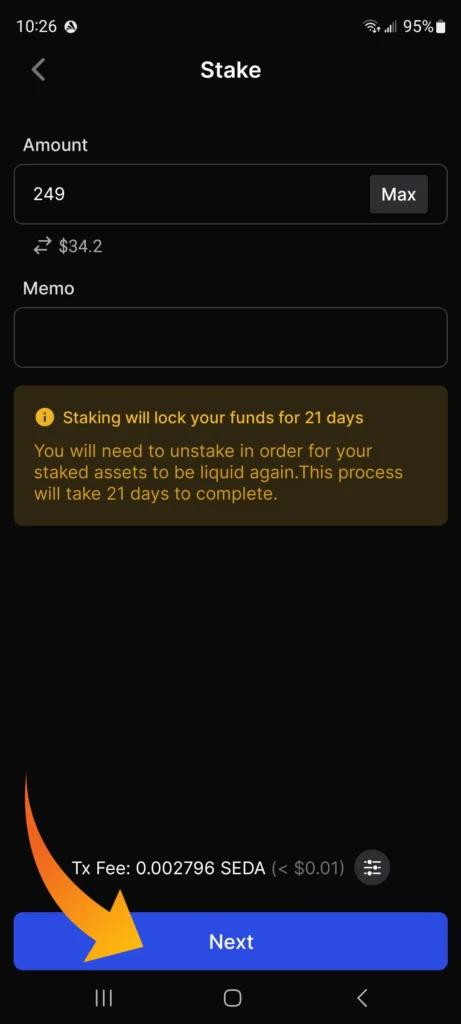 9. Enter the number of SEDA tokens you would like to stake and tap “Next”