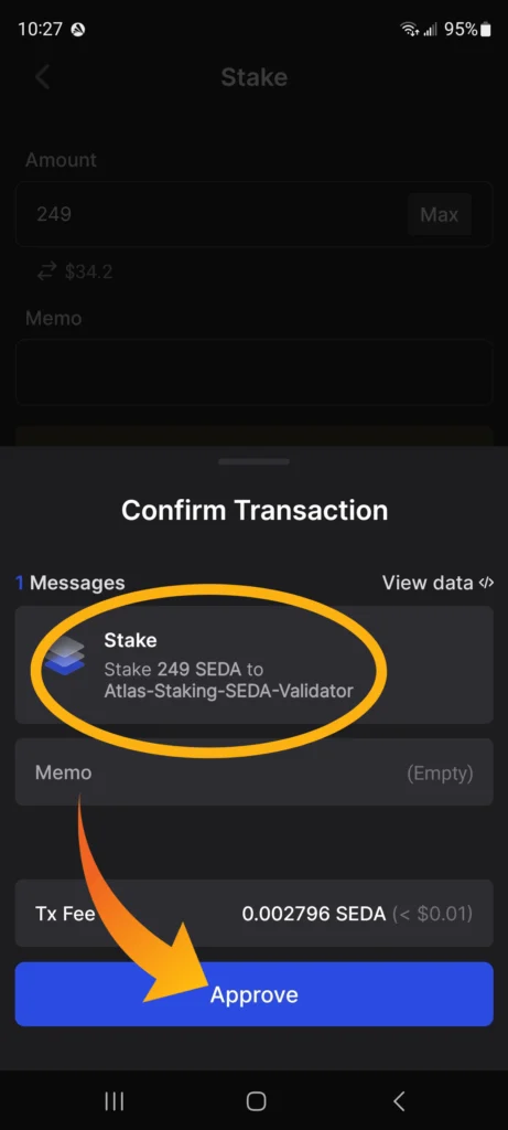 10. Confirm the details of your SEDA staking transaction and then click, “Approve.” (see image below)