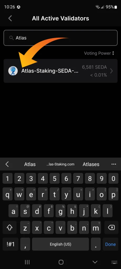 6. Type “Atlas Staking” into the validator search box or scroll down the list to find us. (see image below)